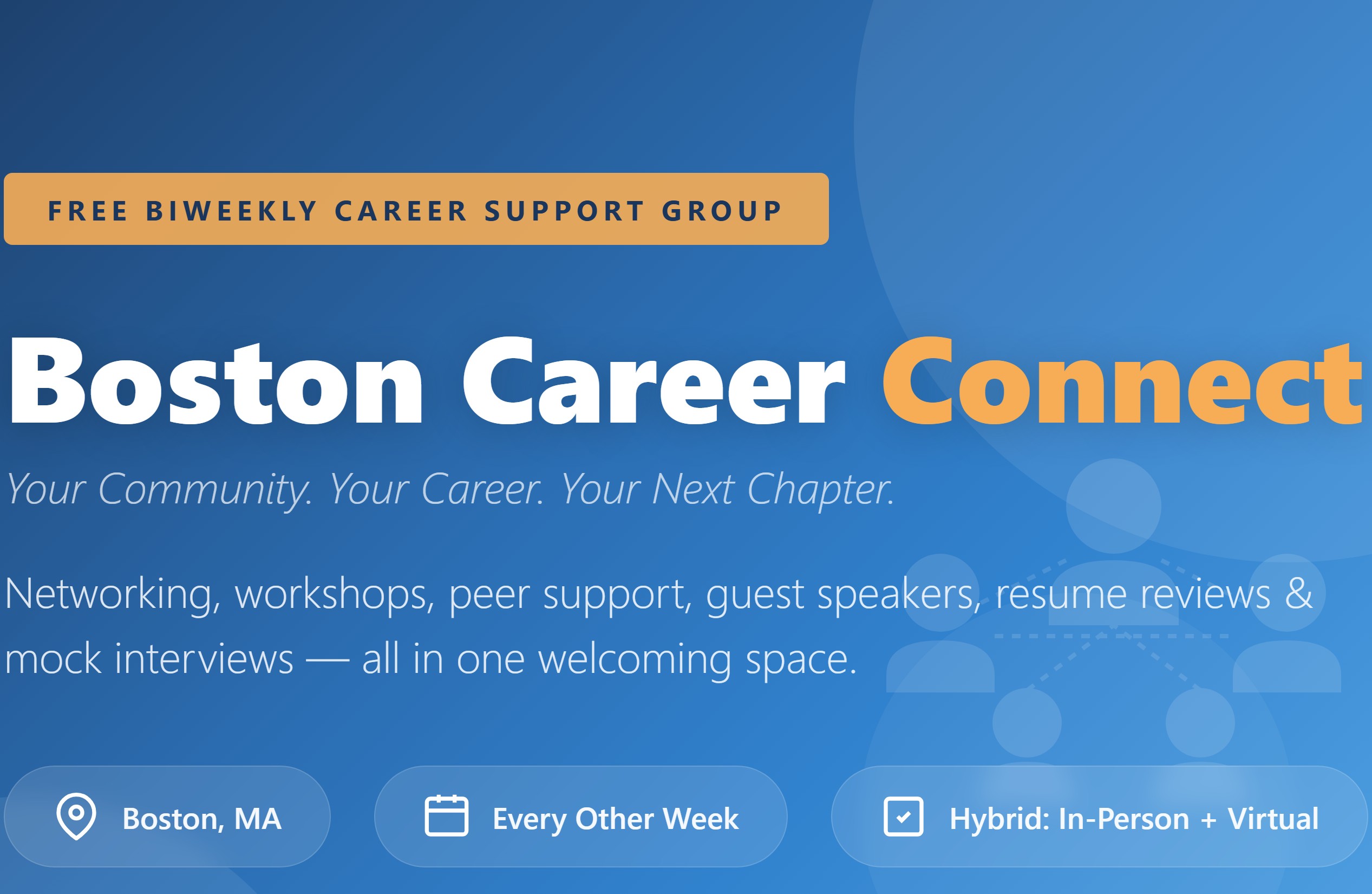 The Boston Career Connect is a free, biweekly career support group designed for job seekers, career changers, and recent graduates in the greater Boston area. Whether you're actively searching, exploring new paths, or looking to build your professional network, this is a welcoming space where you'll find practical support, real connections, and encouragement from people who get it.